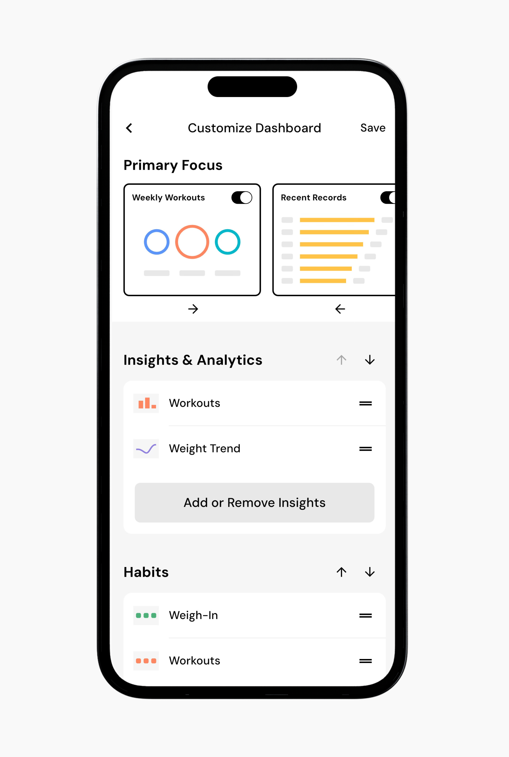 The Body Metrics widget allows you to track, monitor, and visualize changes to scale weight, 24 different body measurements, and progress photos from three different angles. You can read more about body metric and progress photo tracking here.