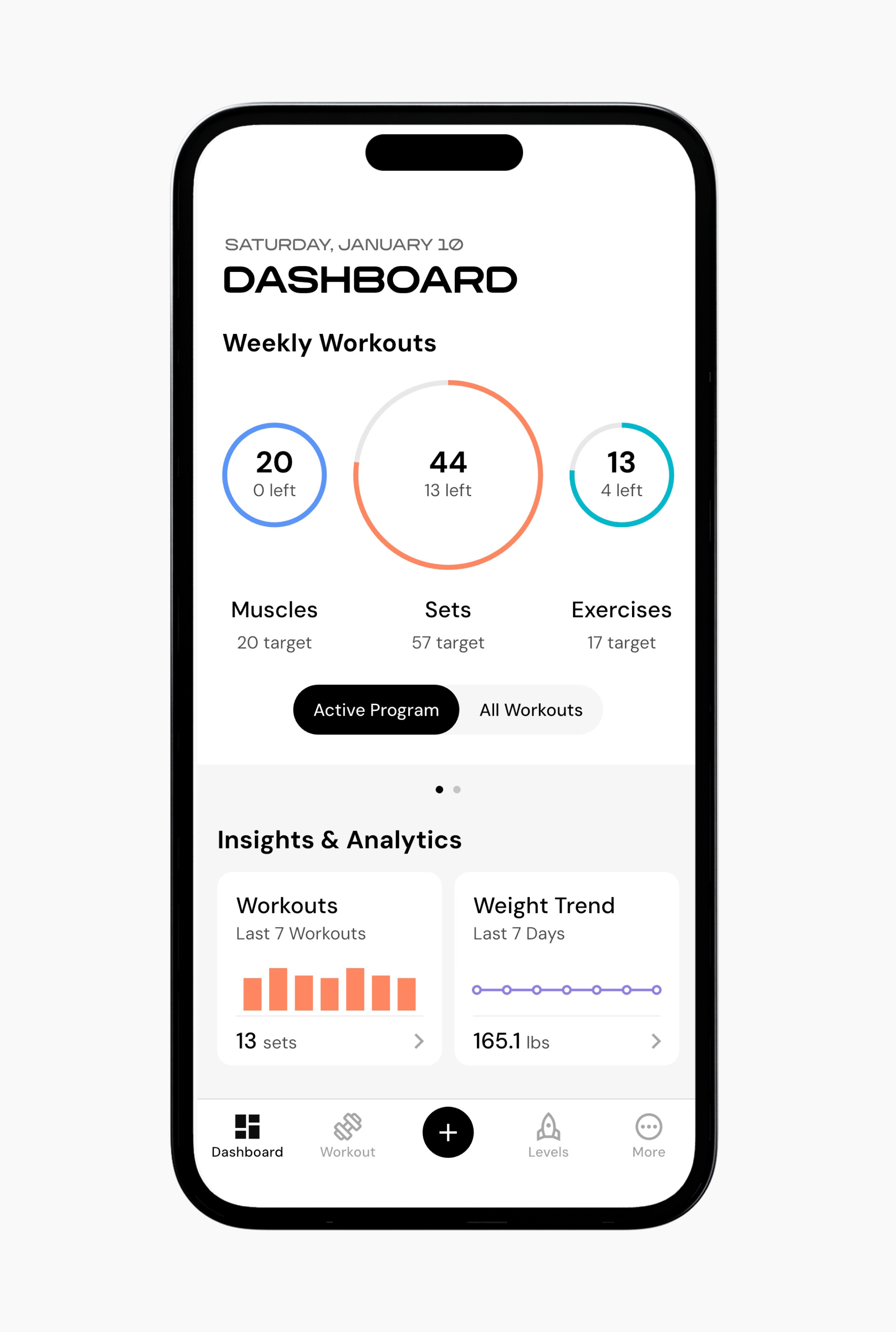 Together, these widgets give you a snapshot of your current progress without needing to deep dive into individual muscle groups or exercises.