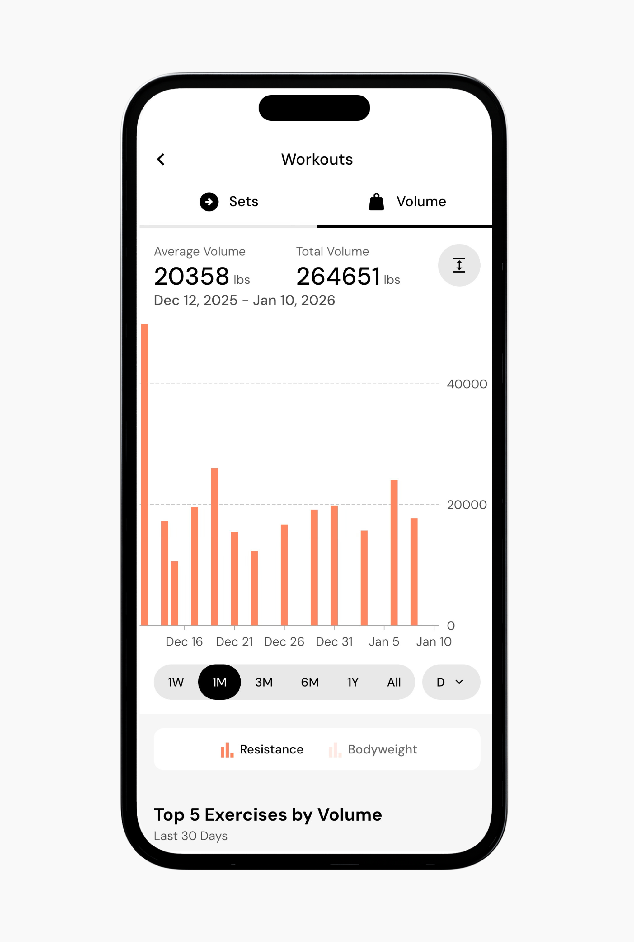 The chart also separates volume into two types: resistance-based volume and bodyweight volume. Resistance-based volume reflects work performed with external load, such as barbells, dumbbells, or machines. Bodyweight volume reflects work where your body is the primary load, such as pull-ups, push-ups, or dips.