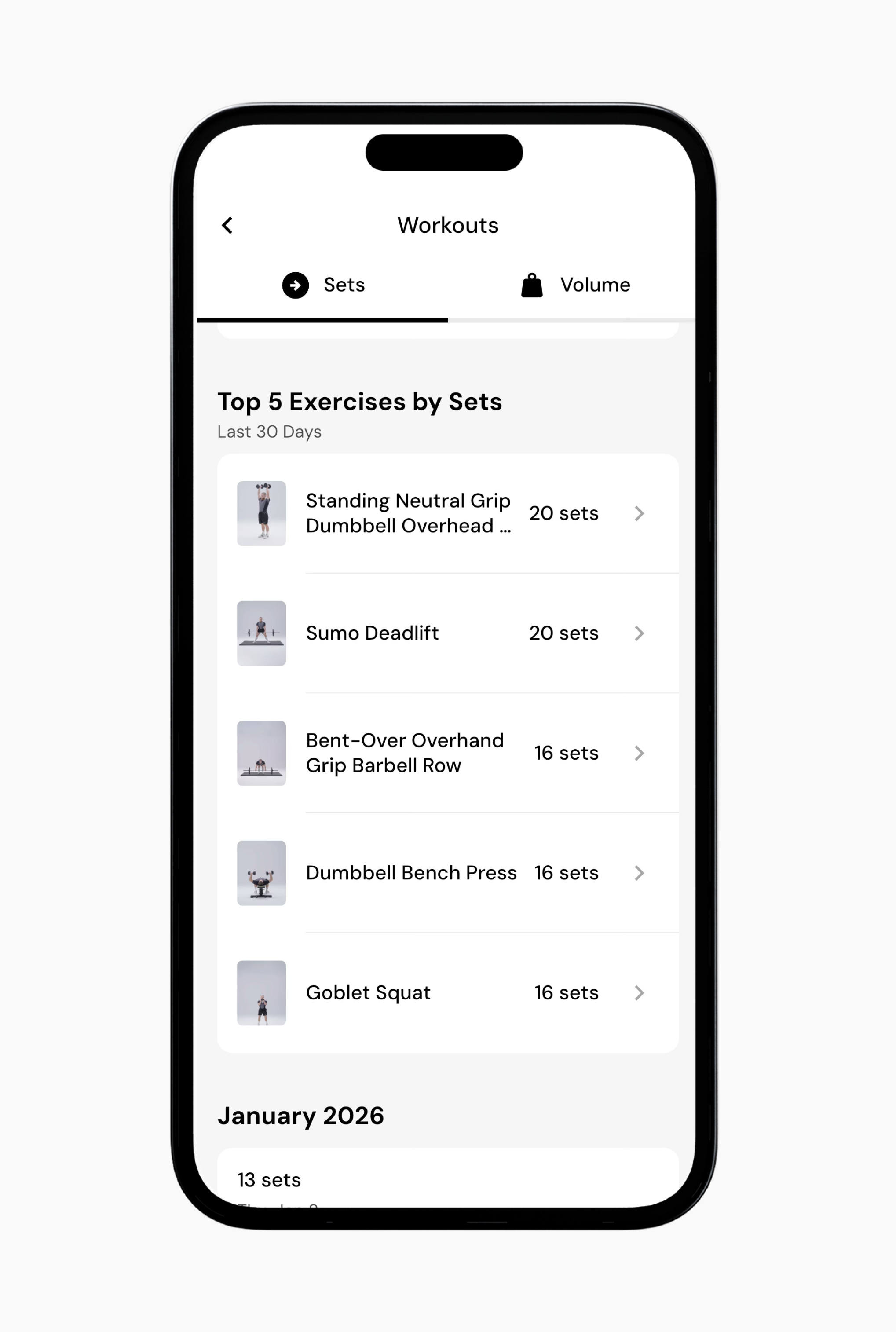 Below the chart, you’ll also see your top exercises by sets for the selected time range. You can tap those exercises to view more detailed breakdowns of your load over time.