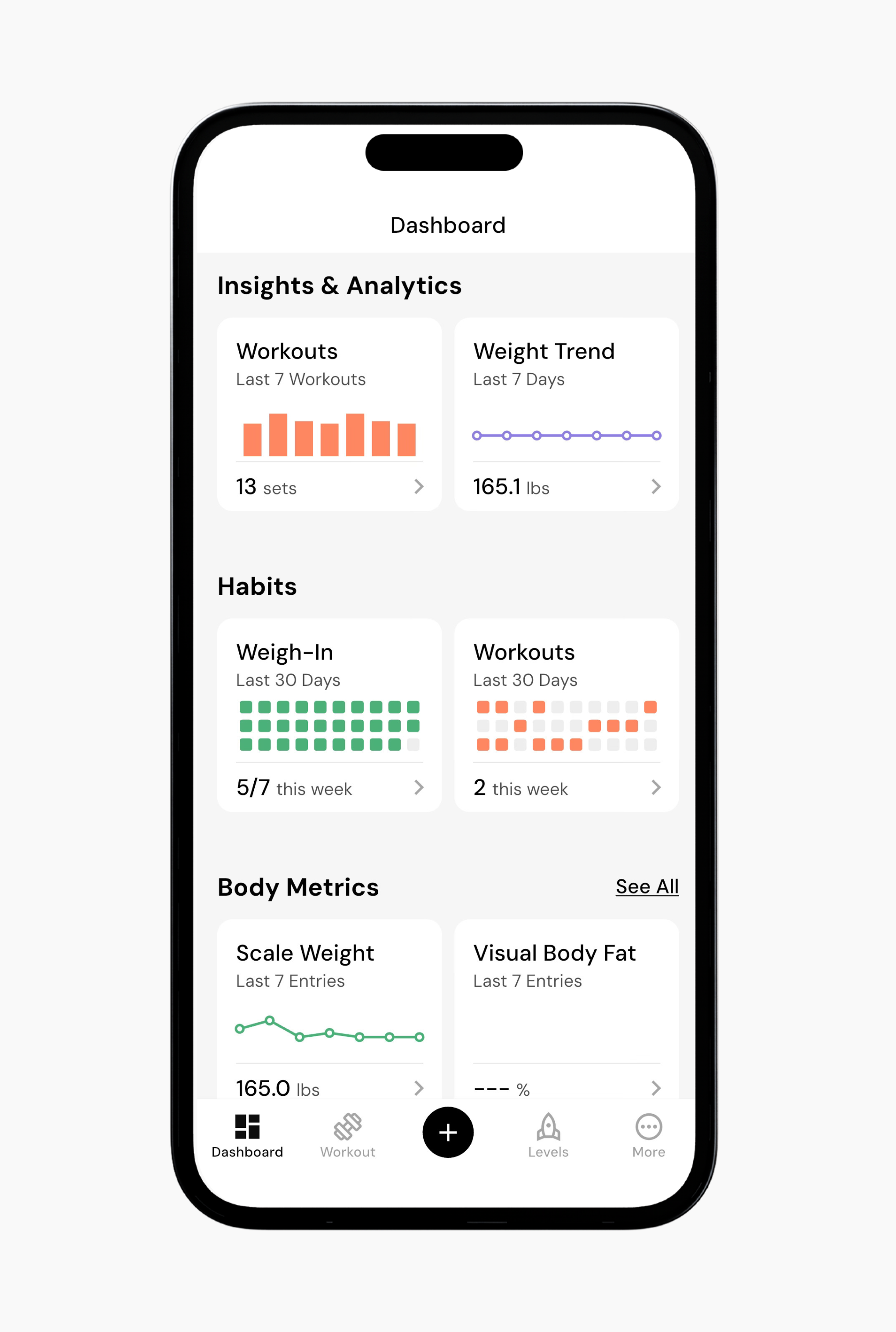 The Workouts tile under “Insights & Analytics” shows you what your training looks like when you zoom out. This section of the app helps you see how sets, volume, and exercise selection accumulate over time.