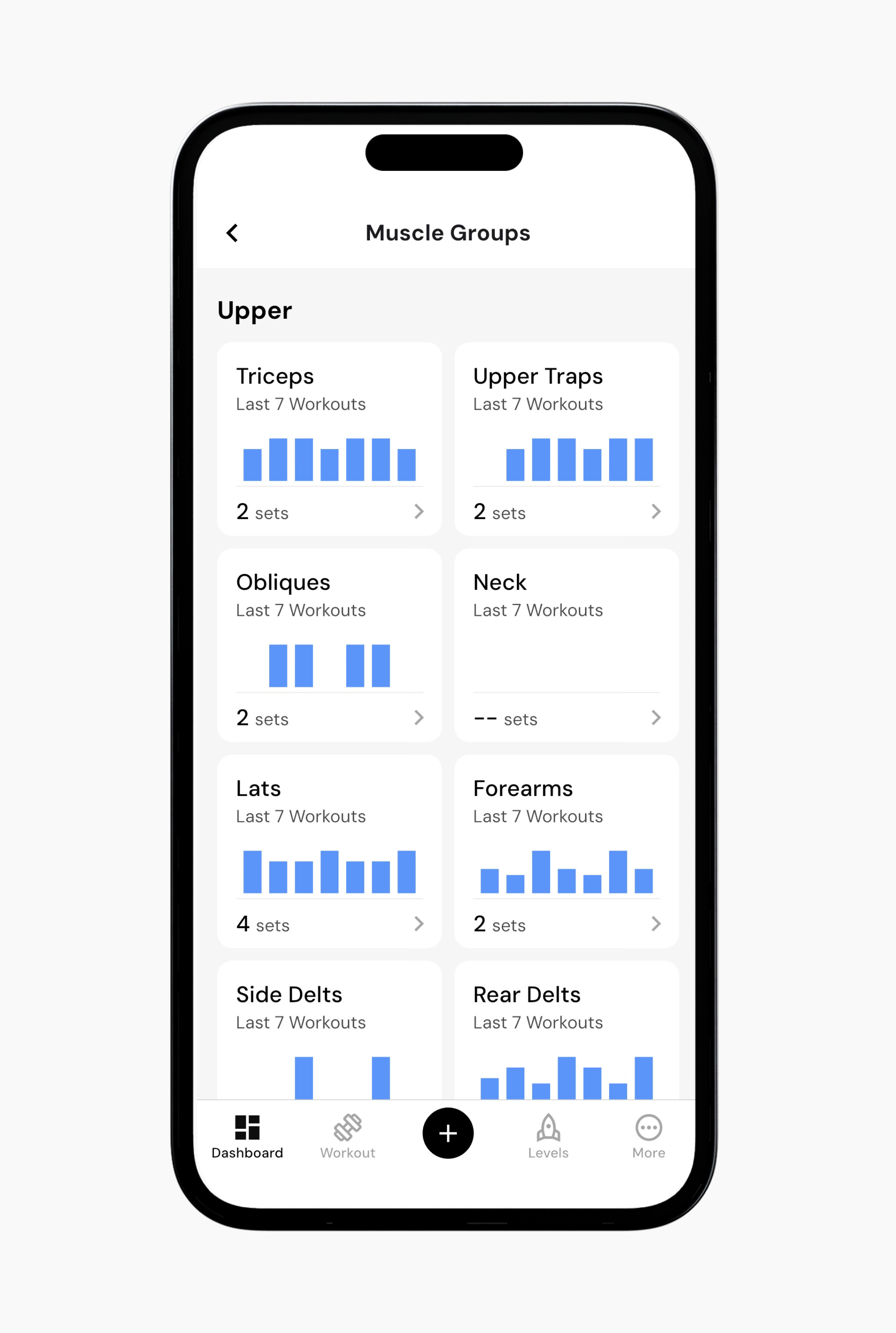 The Muscle Groups section shows how much you are training each muscle group. You can see how many sets you complete and how much total work each muscle group receives over time. This makes it easier to identify whether certain muscle groups may be receiving too much or too little training.