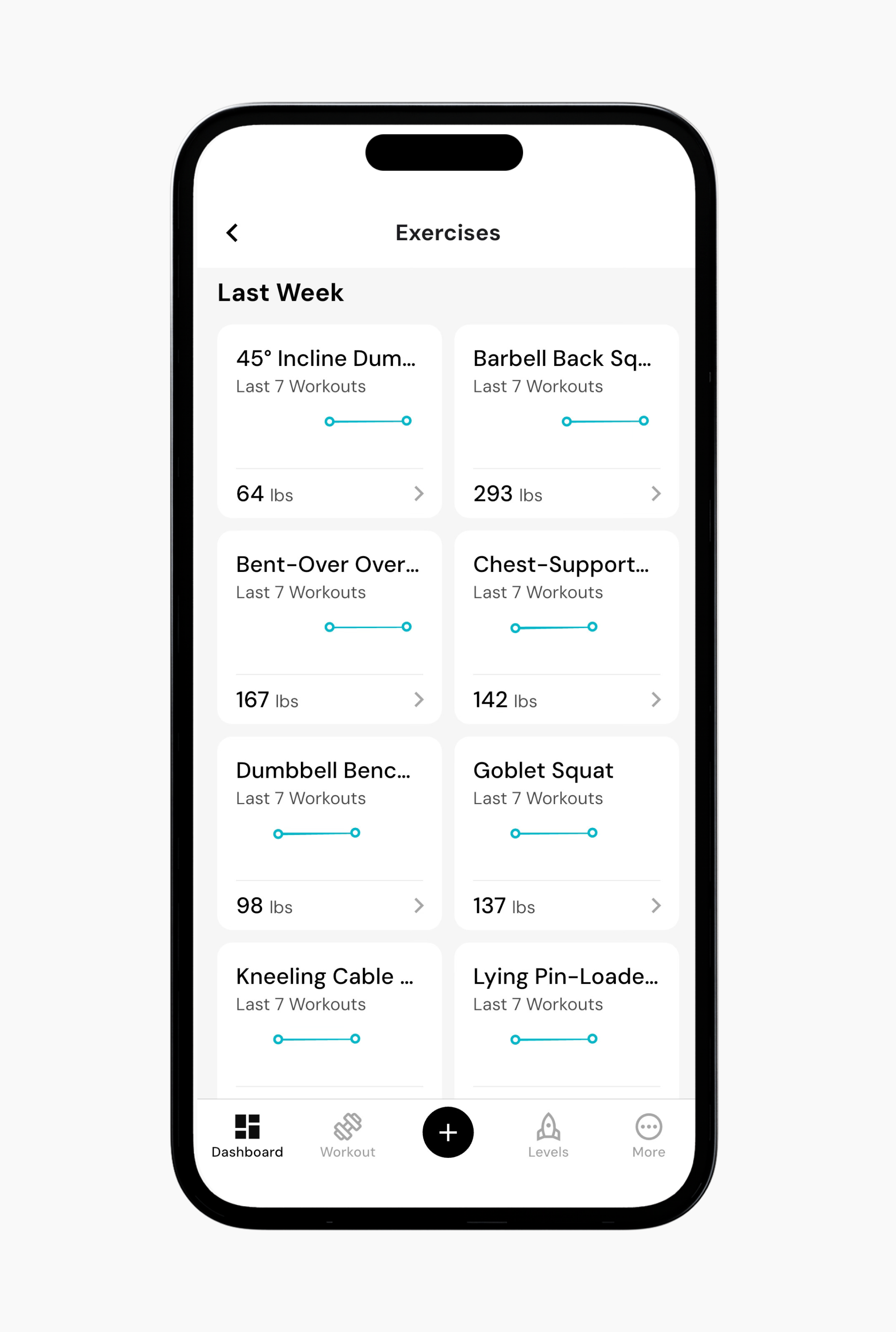 The Exercises section lets you see how individual lifts are progressing over time. Instead of looking at overall workouts or muscle groups, this view focuses on the details of each exercise you perform as well as giving you smart estimations regarding maximal reps and stats on reps, weight, and volume.