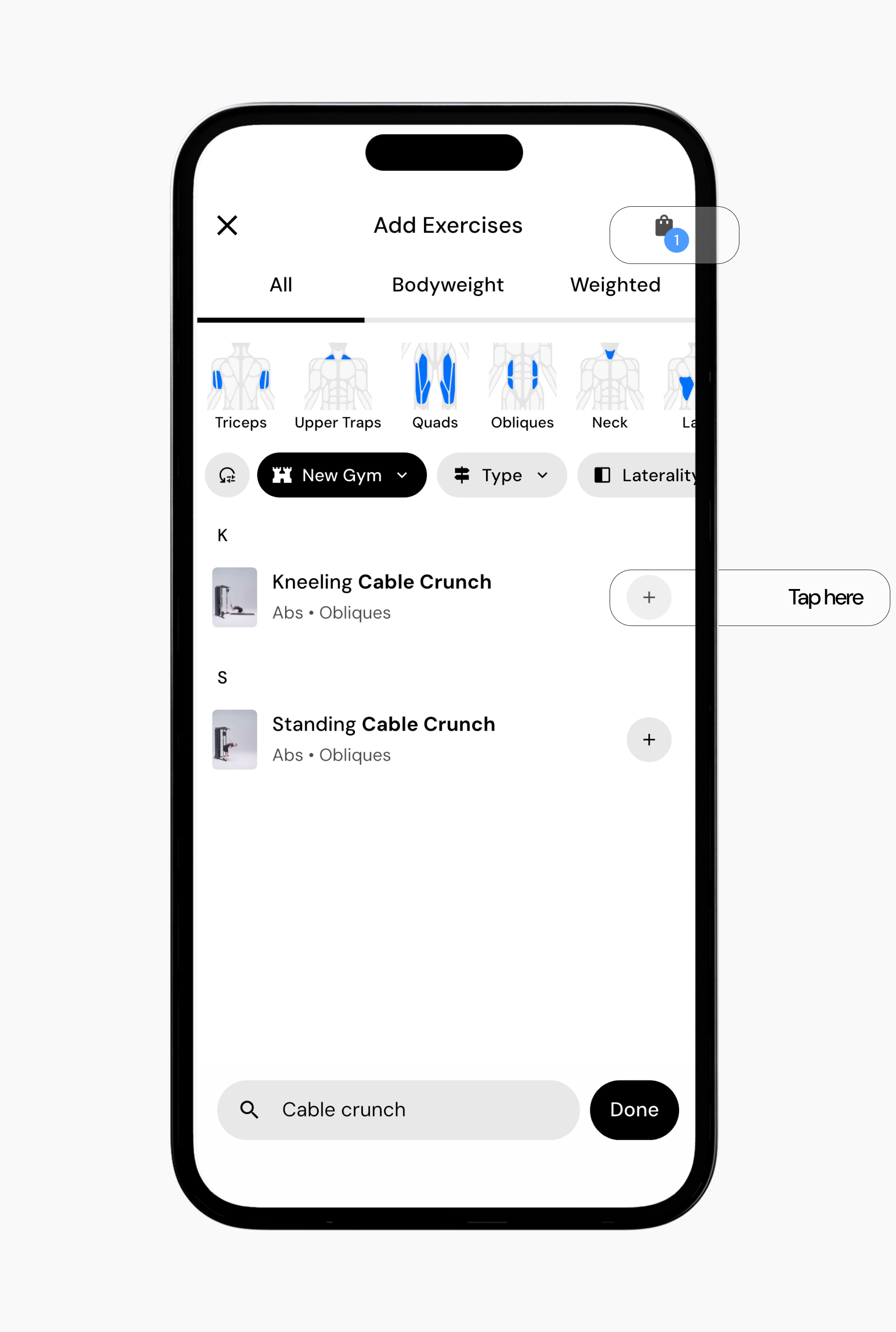 Search for the exercise you want to add, then tap the + button next to the exercise.