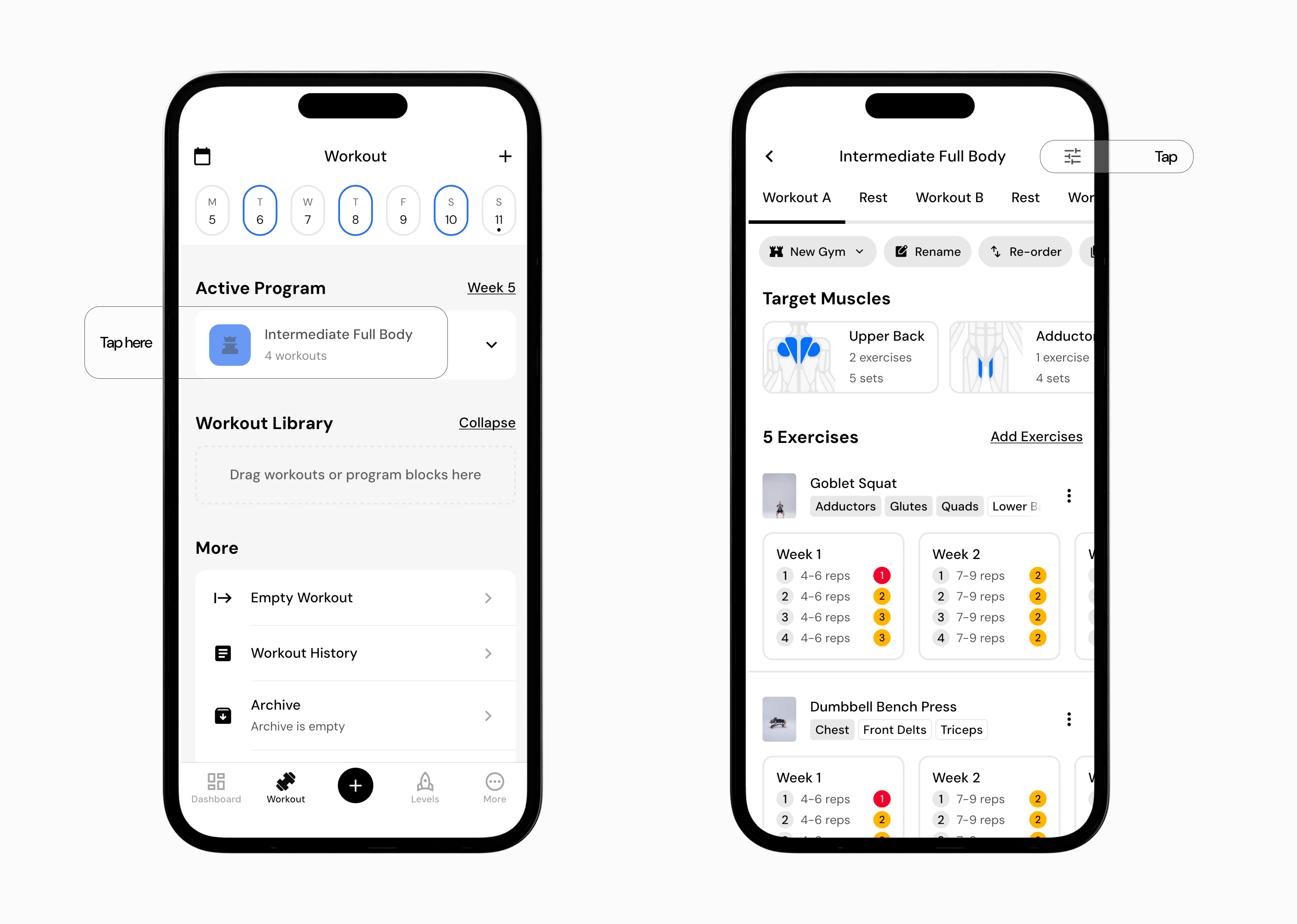 Reorder your active workout days by dragging and dropping. By default, only existing workout days can be moved.