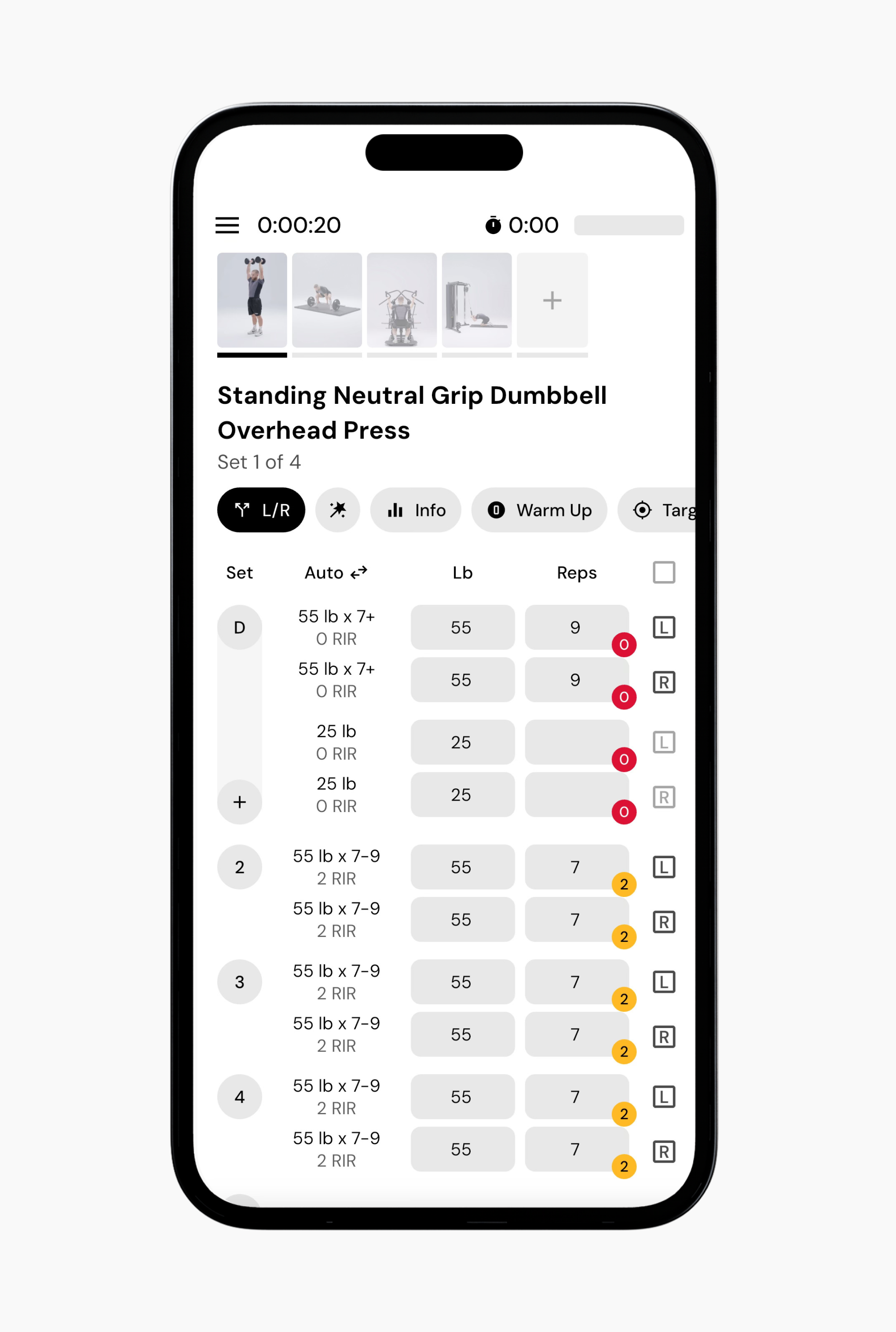 Failure sets are labeled with an F. You log the weight and reps at an RIR of zero to indicate the set was taken to technical failure.