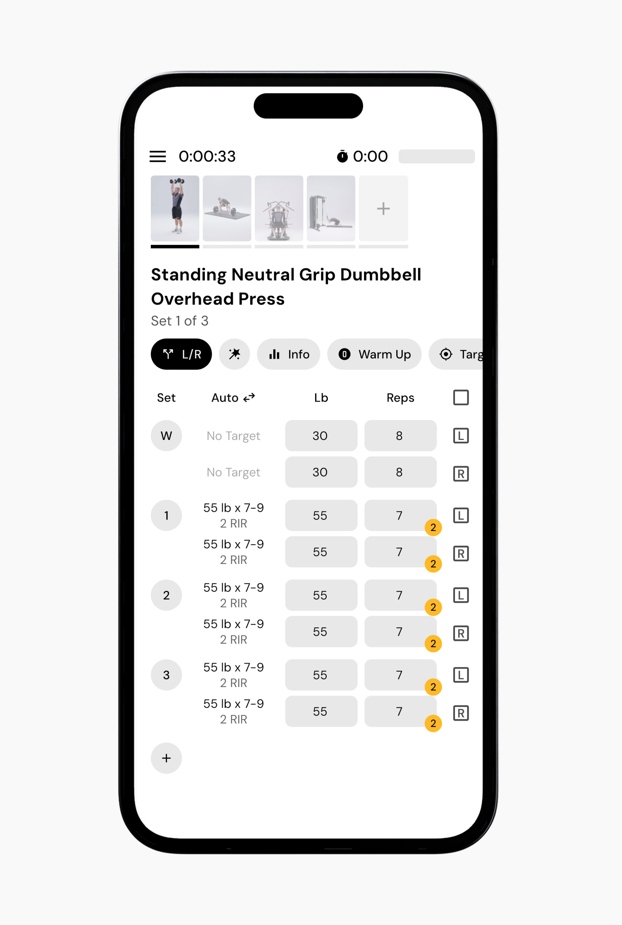 Warm-up sets are labeled with a W. The weight is lower than your standard working sets and is intended to help you ease into heavier loads.