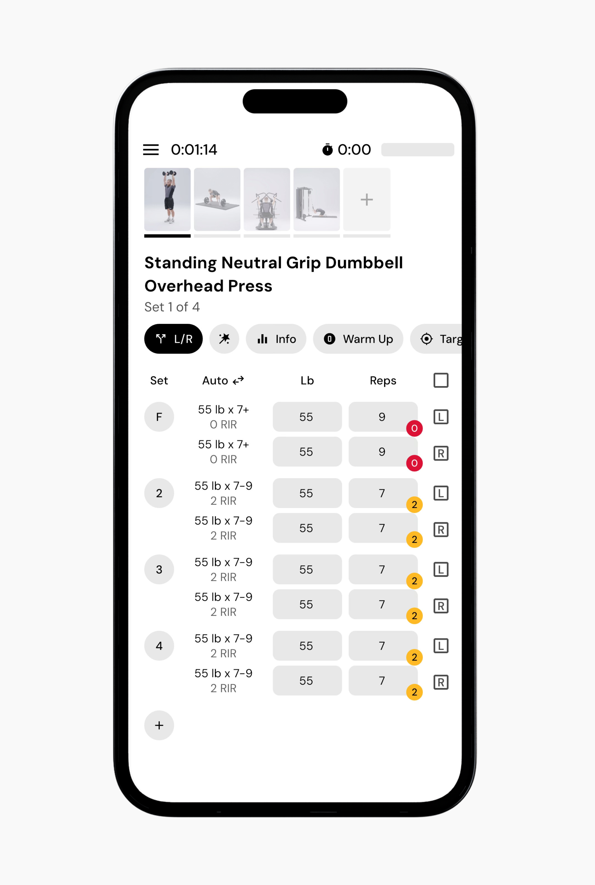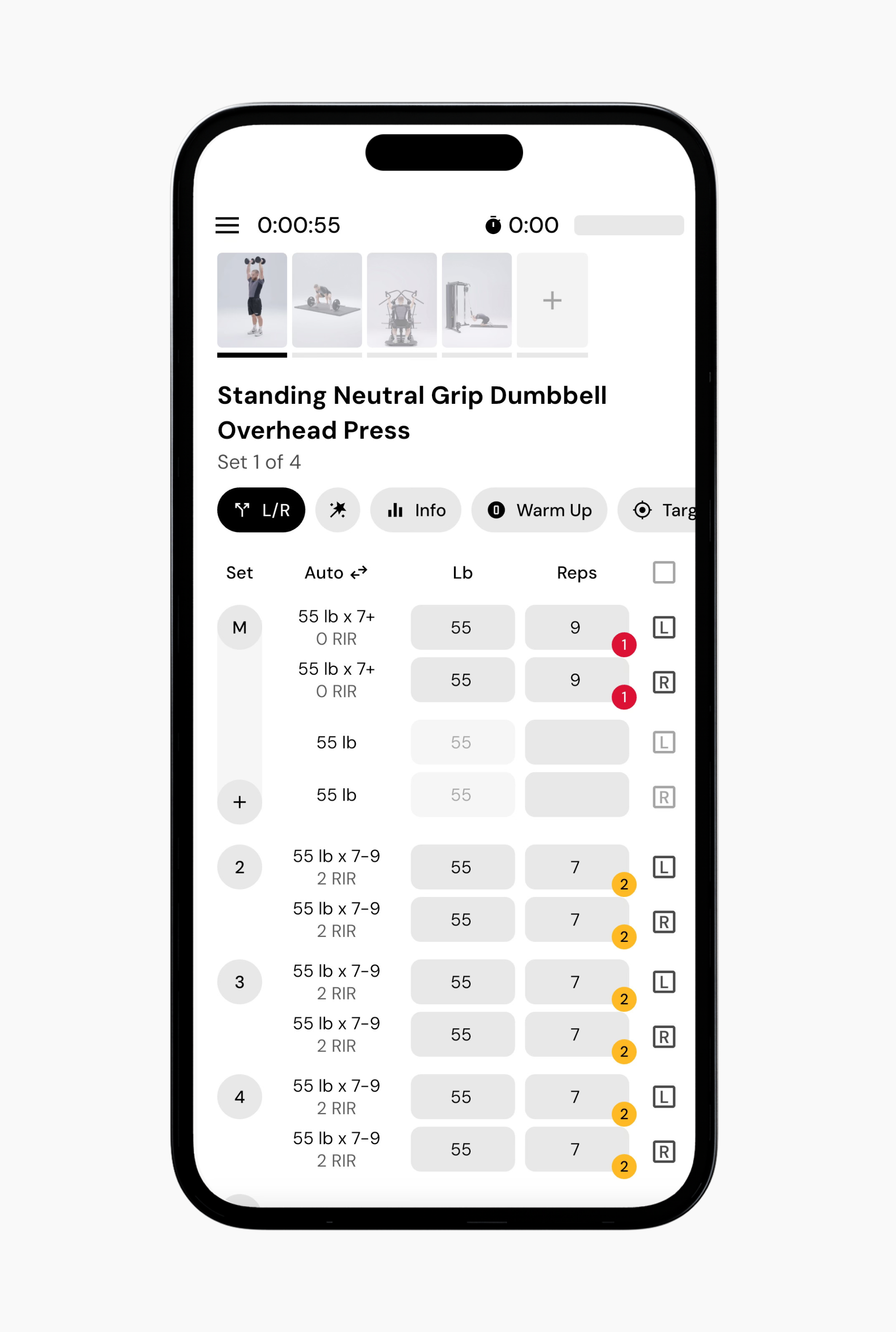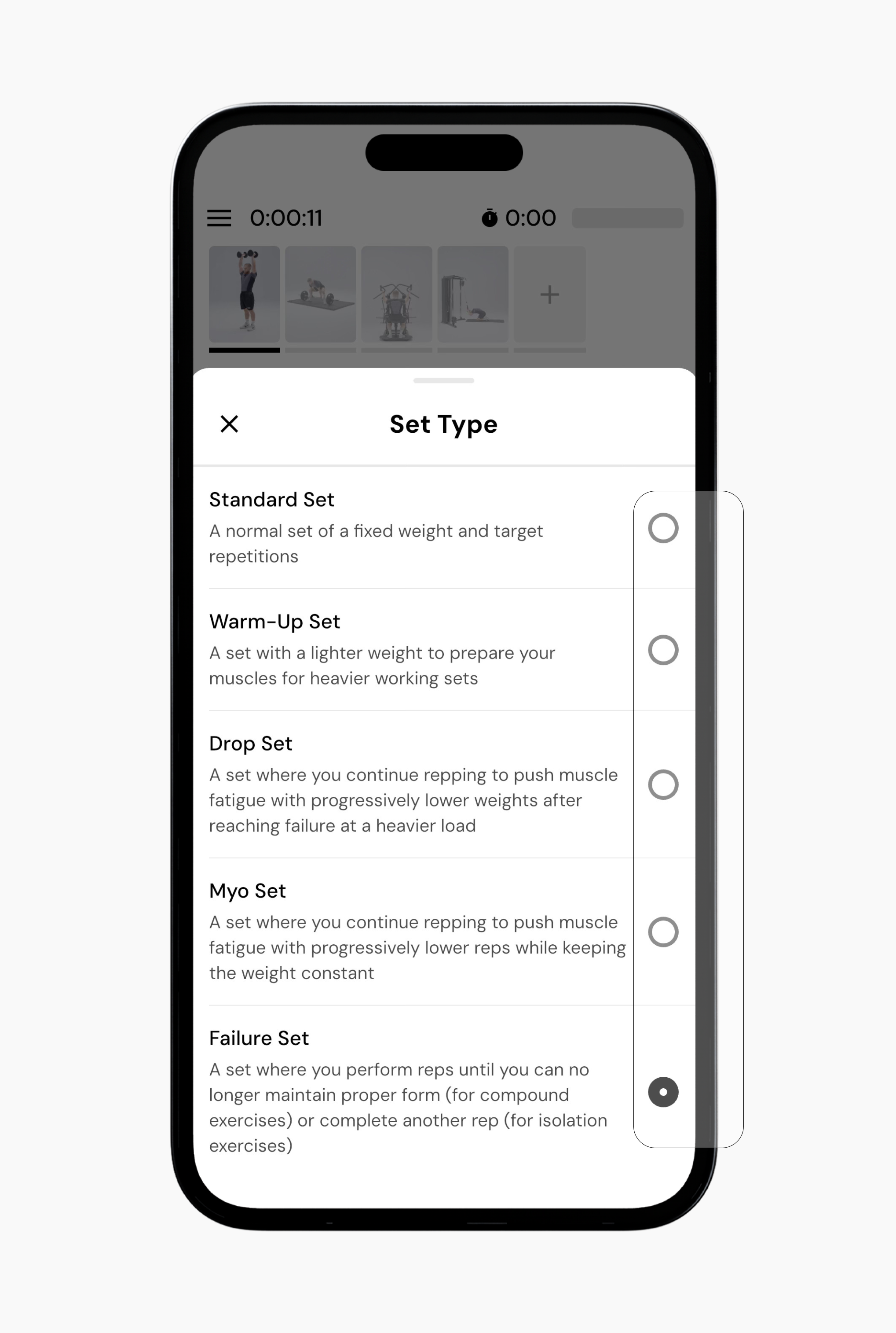 When creating a program or workout, or during an active workout, you can select different set types by tapping the set number.