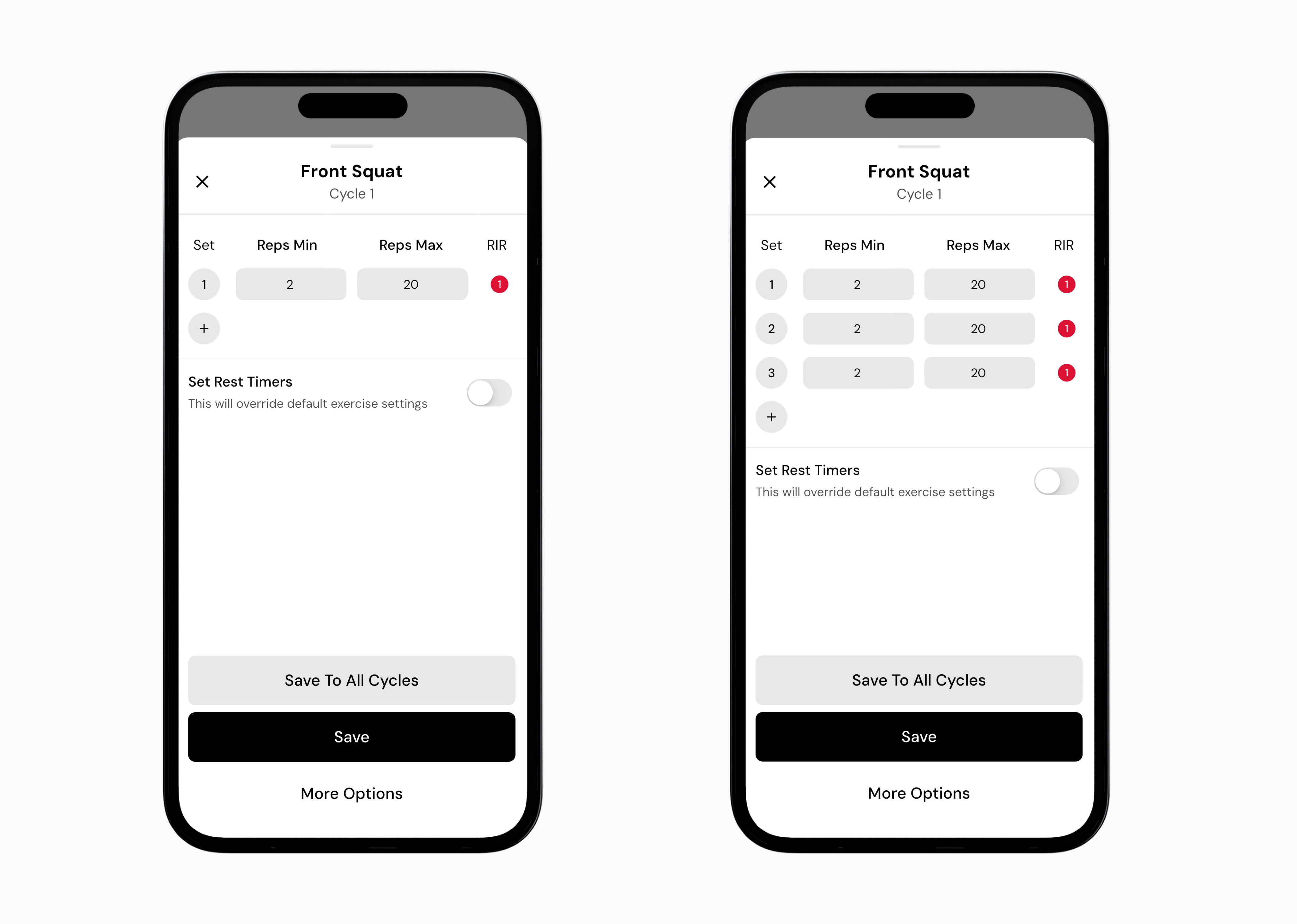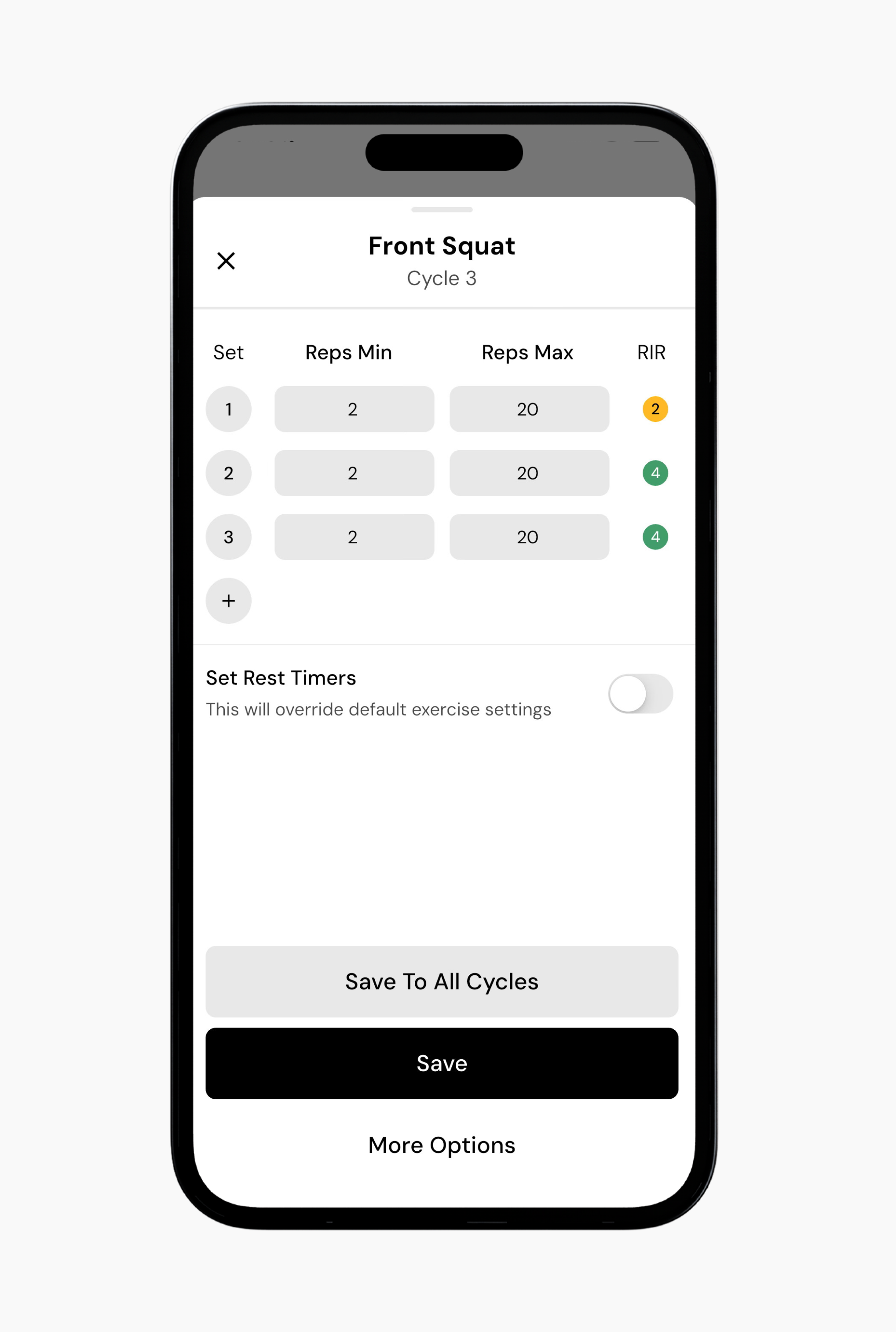 Adjust the sets, reps, and RIR as desired. This is also where you can change set types, like adding myo reps, failure sets, or drop sets.